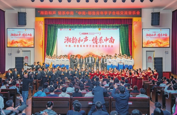 3月26日晚,“湘韵和声·情系中南——中南、耶鲁青年学子合唱交流音乐会”在中南大学开福校区礼堂举办。耶鲁大学Whiffenpoofs合唱团、中南大学升华合唱团及雅礼中学合唱团联袂登台,为嘉宾和师生呈现了一场融汇中西的音乐对话。本次活动由北京大鸾翔宇慈善基金会与中南大学联合主办,旨在以音乐促进青年友谊。图为演出现场。