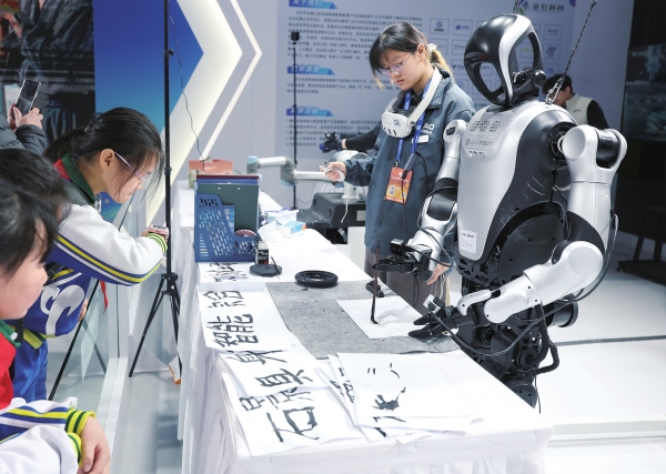 3月27日,2026中国科幻大会开幕式在北京首钢国际会展中心举行。同期举办北京国际科幻与未来产业博览会和2026北京科幻嘉年华等活动。图为当日在博览会现场,一款机器人在展示书写毛笔字。新华社记者
