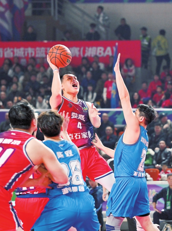3月29日晚,娄底队(红)主场对战湘潭队。娄底队凭借稳定发挥与强硬防守,最终以91∶76拿下主场首胜。刘新山 摄(湖南图片库)