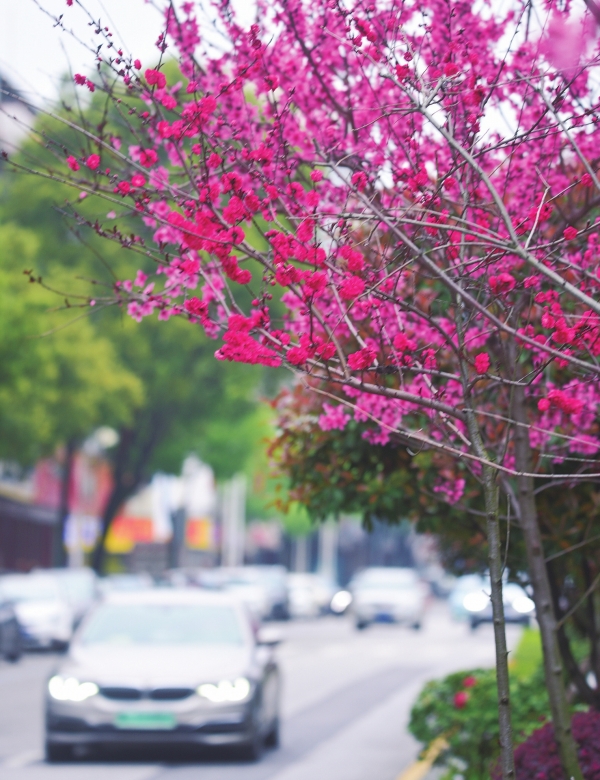3月29日,嘉禾县晋屏大道,3公里长的道路隔离带上,数百株樱花竞相绽放,粉红的花海与街景相得益彰,绘就春日城市美景。