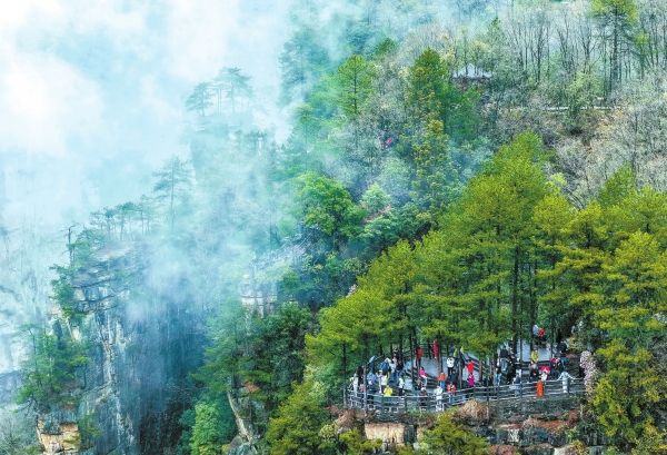3月30日,张家界国家森林公园天子山景区出现云海奇观。连绵春雨中,三千奇峰被缥缈云雾环绕,宛若水墨丹青,吸引众多游客前来观赏。