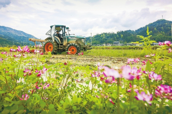 3月31日,龙山县苗儿滩镇黎明村,农机手正驾驶拖拉机进行春耕作业。春暖花开,当地农民积极开展农事活动,田间地头一派忙碌景象。