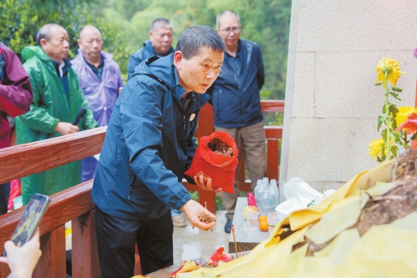当天下午,“寻亲代表团”成员返回了,一路风尘仆仆,带走7抔墓土,用红布包裹。这些浸润着长征英烈气息的泥土,将被带回江西瑞金,安放在革命烈士陵园。瑞金村的村民,依然会在每年清明,登上那288级台阶,清扫墓碑……