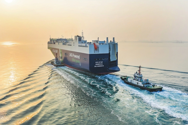 4月2日,为希腊一航运公司建造的7000车位双燃料汽车运输船“洁能之星”轮在山东港口烟台港龙口港区投入运营。该船配备液化天然气(LNG)动力系统,同时采用“氨预留”设计,可在升级改装后使用清洁的氨燃料。图为当日,“洁能之星”轮从烟台港龙口港区起航(无人机照片)。