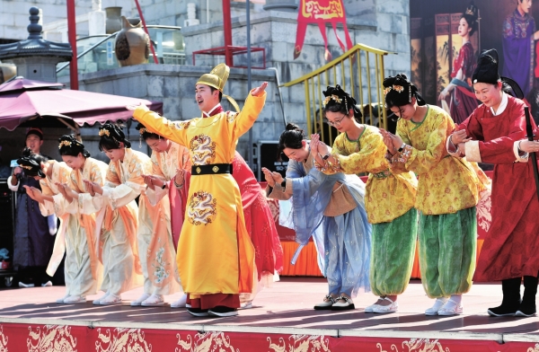 4月4日,长沙铜官窑国风乐园,景区工作人员身着汉服为游客表演。当天,该景区推出“我在盛唐 等你入戏”千人沉浸式体验活动,通过情景演绎带领游客感受盛唐的市井繁华与春日雅趣。