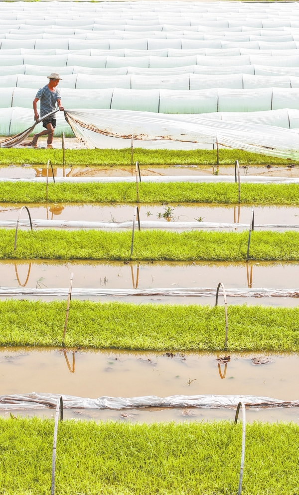 4月5日,祁东县金桥镇,村民揭开早稻育秧田里的覆膜。