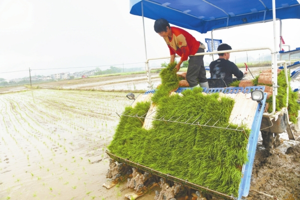 4月6日,江永县潇浦镇接龙桥村,村民在机插早稻秧苗。