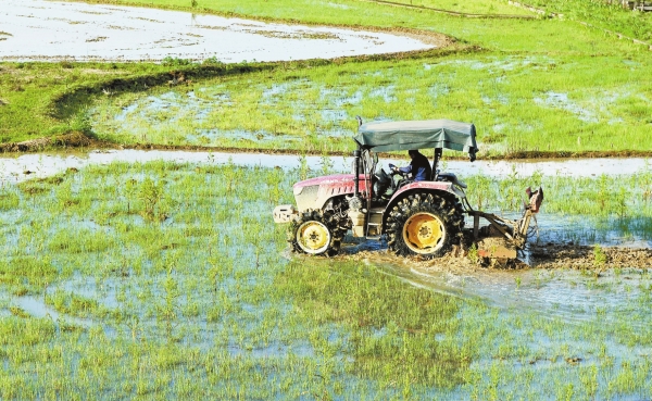 4月4日,洞口县高沙镇樟树村,村民驾驶农机翻耕水田。