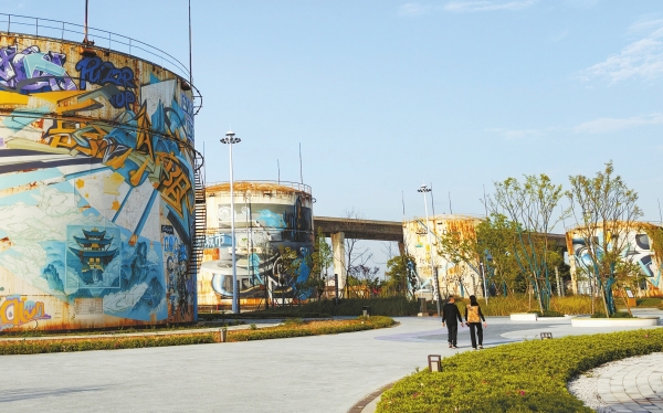 4月4日,岳阳市吉家湖环境综合治理项目(一期)环湖岸线地景观工程“星系广场”,市民在休闲游玩。该项目在环境治理中创新利用湖南石化公司七里山罐区部分设施,通过艺术涂鸦将旧罐体改造为景点,成为市民打卡新地标。