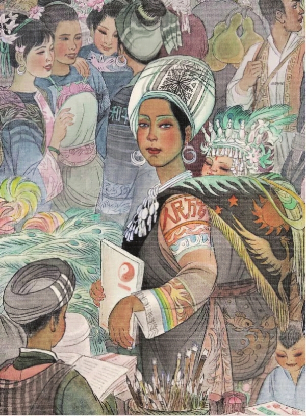 画面上,女人拥挤着、流动着、交谈着;女人们身上都有财富,或孩子或物资;女人苗服的臂膀上分别绣有“人民万岁”“和平”“光明”……画面的核心是臂膀上绣着“人民万岁”的“她”——目光澄澈,容光焕发,她孩子头上首饰叮当,她身前身后是买书的孩子和背着猎枪、别着劳作工具的两代农人……冷寂了的市场重新热闹,女人们重新披红戴彩。“她”的眼睛在说:人民万岁,就叫幸福生活。