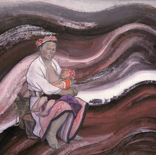 “土地”是母亲的。母亲怀抱喝饱酣睡的婴儿坐在暮色四合的原野上、土地间,身后是劳作的工具背篓,收拢的暮色里是她放牧的牛群。天和地慢慢融为一色,但给劳作后哺乳中的母亲留下来一线光,一线可以让目光延伸的远方。这一线白与她白色的衣裳相依,似是这稳坐大地的母亲,撑起了四合的暮色。她的头巾、裙子,还有她的大脚和怀中的孩童,几乎与暮色组合成一个色块。