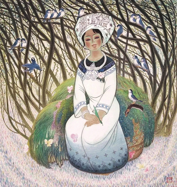 她因画《牧歌》唱牧歌而有了对画面的音乐感的追求。后来到邵阳参加苗家“赶场”,听到了“三月三对歌”,那音乐旋律与姑娘的舞步以及身上的斑斓服饰让她着迷,并由此发现更迷幻的音乐元素:“苗家姑娘总是离不开背篓与伞,五光十色的伞成了我一些画中舞动的音符,形成了我构图的音乐节奏美。”歌有声,伞无音;伞在动,歌在流。都是音符都是节奏,这种动、静相融,使她找到了新的画面意境、女性意境。此后的构图、造型、线条都有了节奏,有了新的艺术情趣。