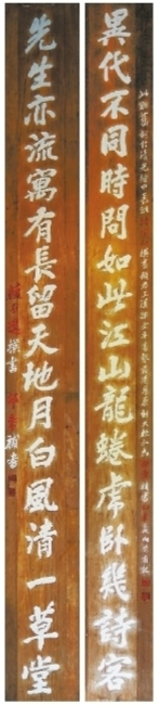 顾复初原书已佚,现大廨所悬为清末翰林邵章补书,向楚旁记。而草堂南门那副,为于立群所书,郭沫若以162字长跋记述了一段雅事:郭沫若年少时诵读此联,念念不忘其“句丽词清,格调高永”,1963年凭记忆嘱于立群书写后,寄回成都草堂。