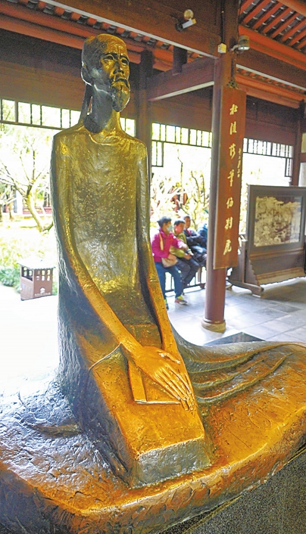 看,朱德、陈毅、郭沫若、何绍基、王闿运所撰楹联,比比皆是;看,刘开渠塑的半身像,胡子摸得发光了;看,潘天寿、叶圣陶手书的匾额,墨迹如新;看,黄庭坚和陆游配祀于祠——他们都曾流寓成都,都学杜诗,分别开创了江西诗派和剑南诗派……