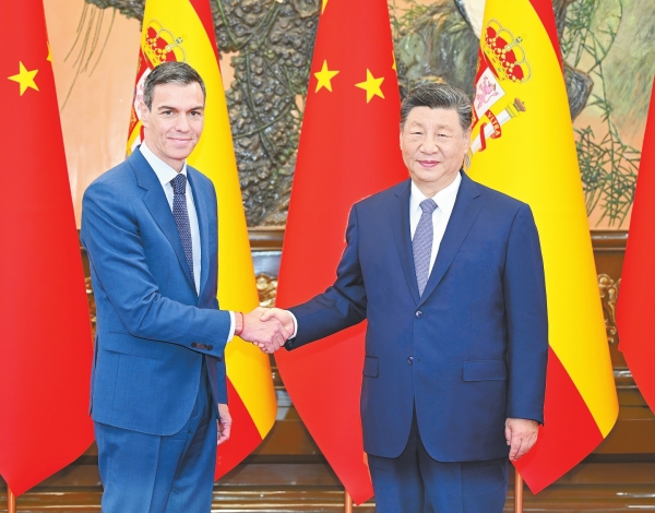 桑切斯表示,我4年来4次访华,表明双方对西中关系的高度重视。中国企业在西投资合作有力促进了西经济发展。西班牙坚定恪守一个中国原则,高度重视中国的大国地位,坚定致力于发展具有战略定力的西中伙伴关系,希望加强贸易、投资、新能源等领域合作,促进人文交流。面对复杂严峻的国际形势和频发多发的冲突争端,只有坚持多边主义、推动构建多极世界才能为人类带来持久和平。西班牙积极支持习近平主席提出的四大全球倡议,愿同中方密切沟通协作,共同应对国际地缘政治、贸易保护主义、气候变化等方面挑战,维护国际法和多边主义。西班牙反对“新冷战”,反对“脱钩断链”,支持欧洲和中国增进沟通理解、加强合作。欧中关系健康发展符合双方共同利益,也有利于世界和平稳定。