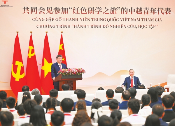 习近平发表讲话,表示去年我和苏林总书记一道启动“红色研学之旅”项目,一年来,两国青年共同探寻中越友好的红色基因,感受中国式现代化的万千气象,在中国各地留下许多互学互鉴、相知相亲的生动故事。不久前,我收到越南河内国家大学外语附中等学校的同学们用中文写来的信,分享了参加“红色研学之旅”的深刻感悟,立志做中越友谊的传承者和传播者,我感到很欣慰。