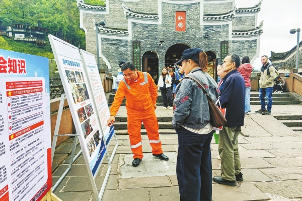 凤凰古城虹桥,国家管网工作人员向市民、游客普及油气管道安全、国家安全法及保密法等知识。滕建康 摄(湖南图片库)