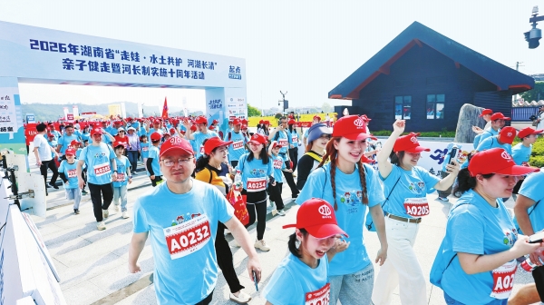4月19日,参赛家庭从比赛起点出发。当天,2026年湖南省“走娃·水土共护 河湖长清”亲子健走暨河长制实施十周年活动,在芷江侗族自治县举行。来自全省各地的1000组家庭、2300余人,沿着㵲水河畔完成9公里健走。(详见3版)