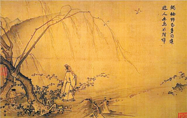 常建跳上小舟,轻启短棹,往李九家赶去。这一天,“天朗气清,惠风和畅”。极目远眺,一线隐隐约约的青山,在远方脱掉了朦胧的岚霭;两岸郁郁葱葱的杨柳,漫向了春天深处。“永和三日”,常建将眼前的小溪与王羲之的兰亭重合在一起。时间折叠,连通了空间——一千多年前的曲水,流到了他的脚下。遥想当年山阴兰亭之集,挥毫会友,曲水流觞,留下了一段千古佳话。诗人不由想:那些欢乐畅怀的情景,会在今天重现吗?小舟终于随波光潋滟的溪水,缓缓悠悠地流到了老友家的门前。岸边,一树盛放的桃花,在阳光下一瓣一瓣展开了所有的美丽。