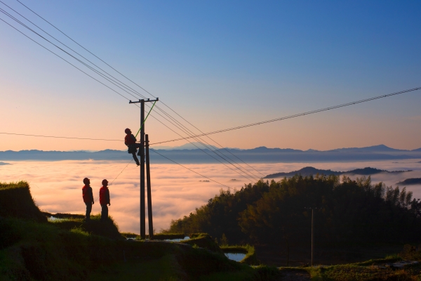 国网娄底供电公司(电骏马)东方红共产党员服务队队员在清除线路上的异物。