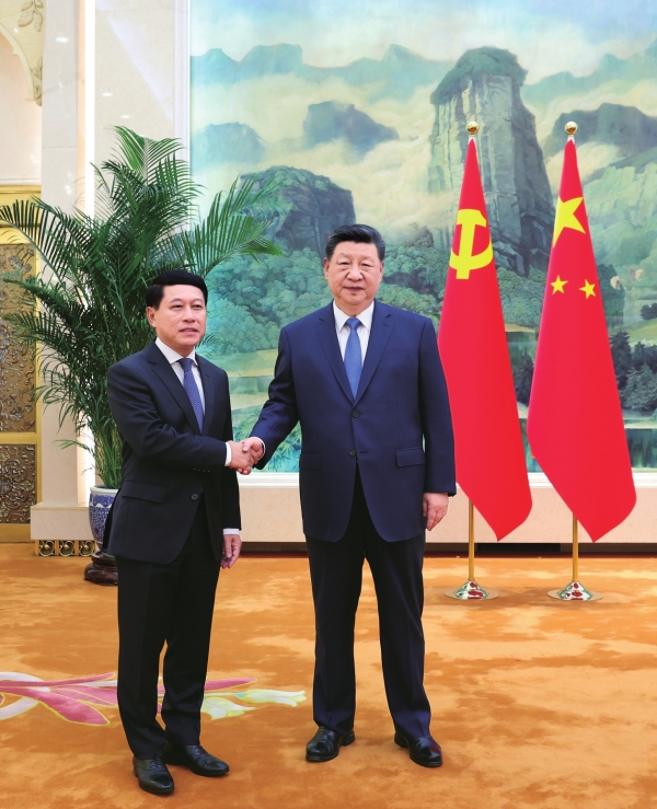 4月21日下午,中共中央总书记、国家主席习近平在北京人民大会堂会见作为老挝人民革命党中央总书记、国家主席通伦特使专程来访的老挝人革党中央政治局委员、常务副总理沙伦赛。新华社记者 黄敬文 摄