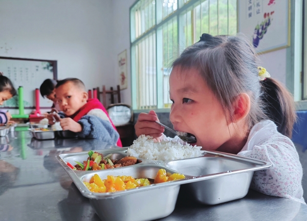4月22日,桂东县清泉镇九年一贯制学校,孩子们享用着热气腾腾的营养午餐。近年来,该县扎实推进实施农村义务教育学生营养改善计划,科学搭配肉蛋果蔬与五谷杂粮,用健康膳食守护山区学子茁壮成长。