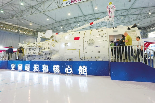 4月24日,第十一个“中国航天日”主场活动在成都启动,主题为“七秩问天路 携手探九霄”。本次主场活动包括启动仪式、航天科普展览、航天文化艺术论坛等。图为当日,参会嘉宾在航天科普展览上参观空间站天和核心舱。