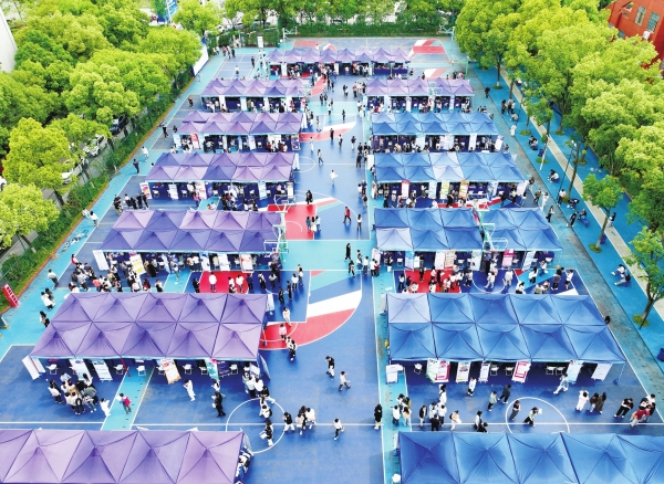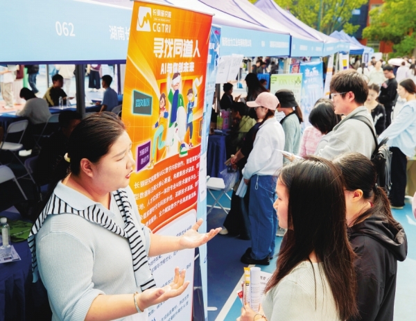 4月24日,湖南工商大学学生在现场了解企业信息。当天,“智汇潇湘 才聚湖南”春季促就业攻坚行动暨湖南工商大学2026届毕业生大型供需见面会举行。200余家行业领军企业齐聚校园,提供6000余个岗位,吸引众多学子前来求职。活动以政企校联动模式畅通毕业生求职择业渠道,积极引导青年留湘扎根、逐梦前行。