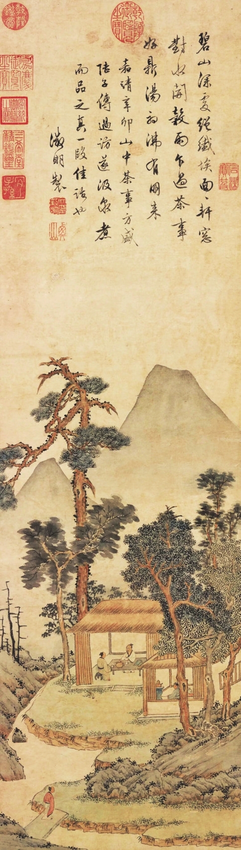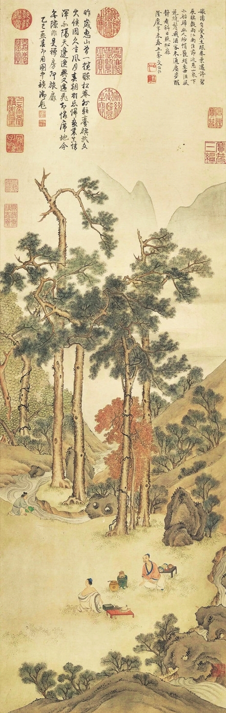 画作上端,文伯仁题写道:幽人纱帽笼头坐,曲径风花绕鬓飞。酒客未通尘梦醒,静看斜日照松扉。隐士静坐茶席,落花绕鬓纷飞,酒醉的客人还未从尘世的梦中清醒,太阳照常落下,映照着溪边的古松。
