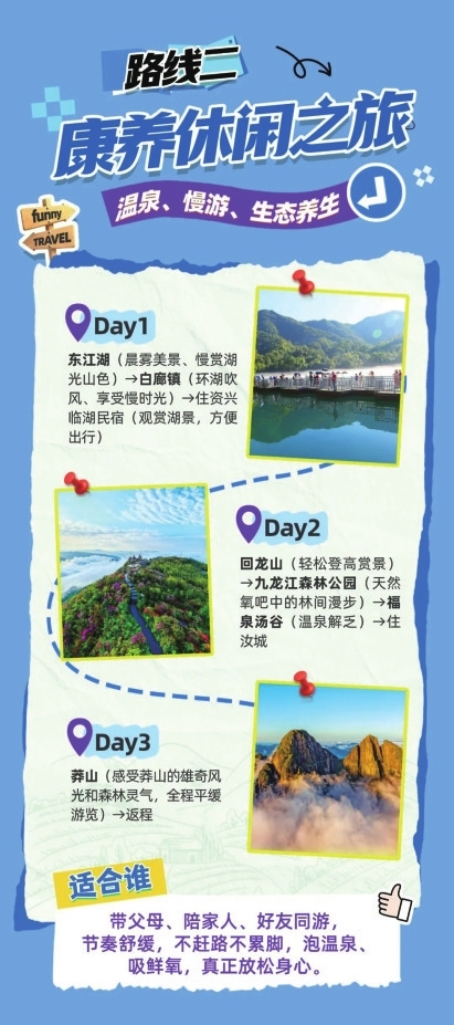 郴州北湖机场通达国内多城,高铁直达郴州西站,市内旅游专线串联各大景区。环湖、环山步道错落交织,无论是自驾、骑行还是漫步,都能一路赏尽山水风光。
