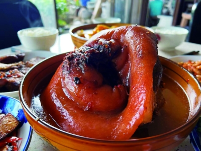 肘子,也是一项大工程,必定请出家里那口硕大的高压锅,占着一个火灶,滋滋啦啦地响好久,才能肉皮软糯,瘦肉酥烂。在天然的冰箱:窗外。静置到年夜饭再复热上桌,才算全套的功夫。各家的卤料不一样,风味也就不同。我独爱加了浏阳豆豉和干辣椒碎的那个味道,让温吞的肘子有了点划破长空的棱角!