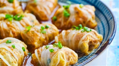 5.将白菜叶子展开,放一勺肉馅,再把菜叶卷起来,放在盘子里。