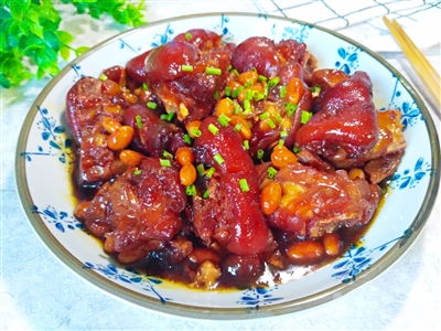 用料:猪蹄1只,黄豆适量,冰糖、生抽、老抽、蚝油、八角、桂皮、香叶、葱姜蒜、食用油等适量。