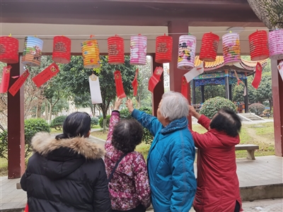 在社区居民们共吃元宵,喜猜灯谜的同时,蓉园社区在职党员与社区志愿者分组结队,将一碗碗元宵、一份份心意送到社区空巢、失独家庭。“感谢组织还记得我们这些老人家,组织的关心关爱我一生难忘。”70岁的黄奶奶感动地握住志愿者的手,“这个元宵节我过得很温暖,很难忘。”