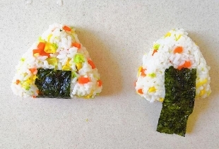 材料:由米饭、玉米、西蓝花、胡萝卜、诲苔片、熟由芝麻、盐。