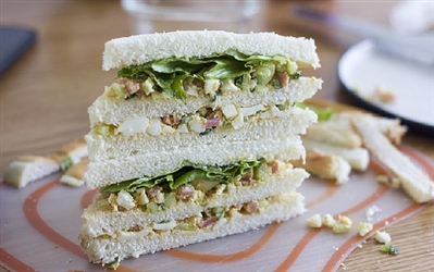 材料:鸡蛋、吐司、黄瓜丁、火腿丁、盐、黑胡椒、番茄酱、沙拉酱。