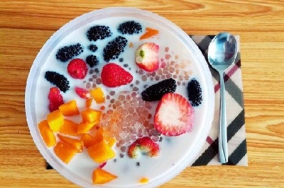 材料:西米、椰汁、椰浆、芒果、草莓、桑葚、炼乳。