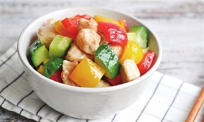 8.加入彩椒块和黄瓜丁,翻炒2分钟,撒入盐拌匀食用。