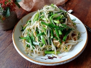 食材:绿豆芽400克、干豆腐(豆皮)2张、韭菜1把、油盐适量、姜2片、大蒜2瓣、鸡精1茶匙。