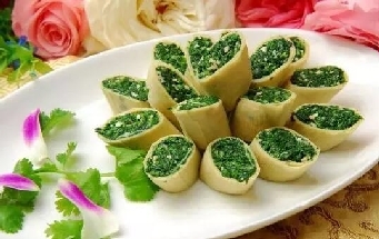2.百页一切二用滚水烫泡后冷开水激凉沥干,摊放在洁净的砧板上,一端放荠菜馅,卷成长卷,斜切装盘即可。