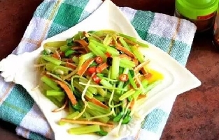 1.芹菜取嫩茎洗净,入沸水锅烫断生,捞出用冷开水激凉沥干,加盐、蘑菇精、麻油拌和。