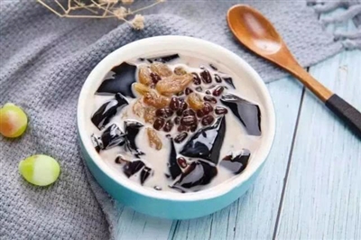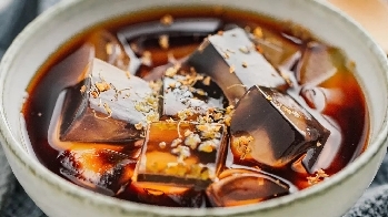 5.将成形的烧仙草用小刀划成自己喜欢的大小,盛入碗中,搭配牛奶、红豆、葡萄干或自己喜欢的食材即可开吃。