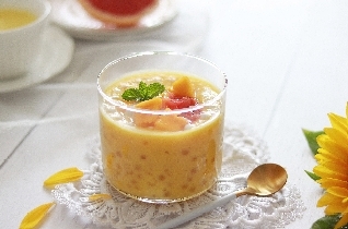 5.最后将搅拌好的芒果露倒入容器中,加入西米搅拌均匀,然后在上面铺上芒果粒即可。