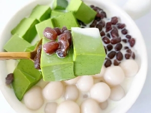 5.把定型好的奶冻切块放入碗中,加入蜜豆和丸子,倒入牛奶,抹茶奶冻白玉丸子就做好了。