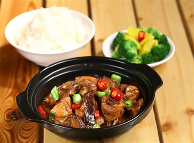 3.倒人鸭块,翻炒至鸭肉水干并且油脂析出后,盛出备用;