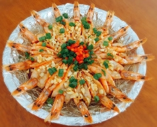 2.将粉条盘在—个大盘子里,然后将大虾整齐地摆放在粉丝上;