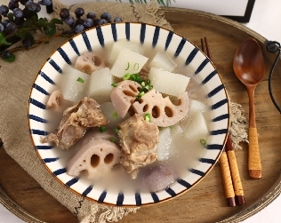 材料:莲藕1根,排骨300克,葱段、葱花、姜片、料酒、食盐适量