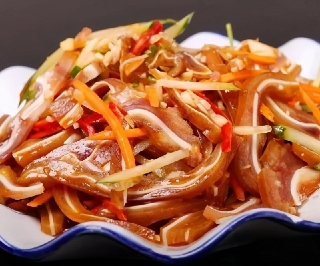 5.猪耳朵切成片状,整齐码放在盘子里,浇人调料汁搅拌后即可食用。