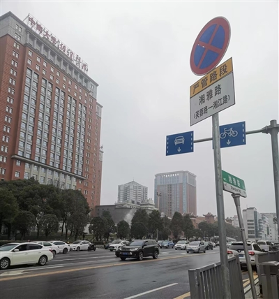今天上午,长沙市湘雅路芙蓉路口,几位工人正在路口竖立起新的交通标志,在人们常见的禁停标志下,新标志多了两排方形的辅助标志,一块为黄色的“严管路段”,一块是地点,“湘雅路-湘江路-芙蓉路”。工人介绍,目前,湘雅路的标识已经完工,下午将去湘春路和黄兴路。