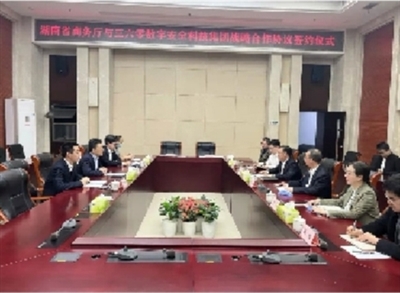 湖南省商务厅副厅长李心球、360 集团战略合作部副总裁李嶴代表双方进行了签约。湖南省商务厅电商处、中非秘书处、地区合作一处、雨花区政府主要负责人,360 集团战略合作部、360 集团政企安全集团城市产业事业群解决方案负责人参与了签约与座谈活动。